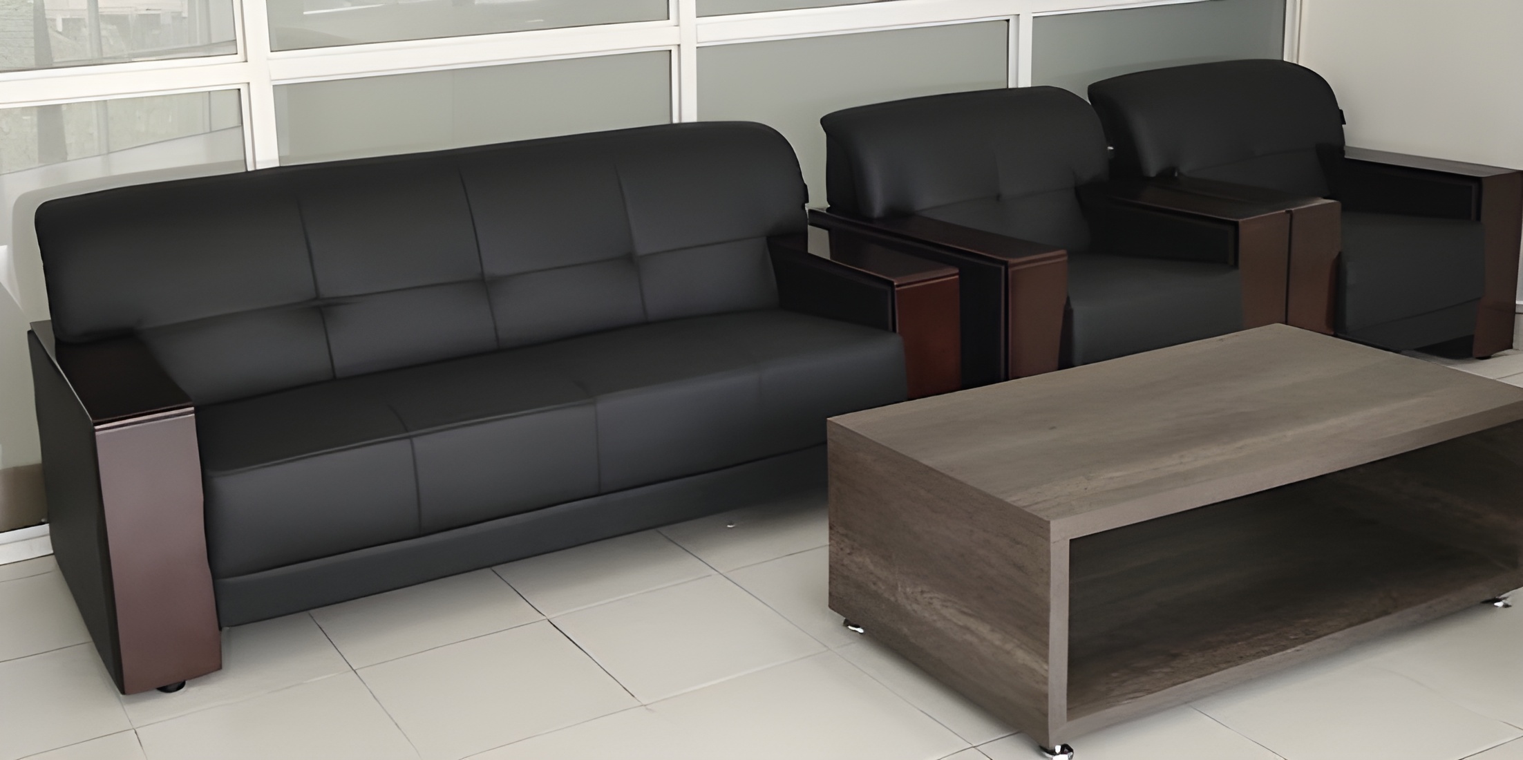 The Kifaru Leather Sofa – KLS combines modern comfort with natural elegance, making it ideal for professional and residential spaces in Nairobi and across Kenya. Upholstered in high-quality leather, it offers both durability and a luxurious feel, while the polished wooden armrest finish adds warmth and sophistication. Perfect for offices, reception areas, or living rooms, it brings functional beauty to any setting.